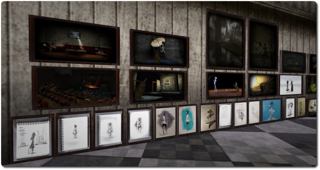 My interest is more about the layout, design, and challenges of the gallery that Bryn created. On this its worth noting that the artist herself built the space. She has both intimate knowledge of the work to be posted and complete control over the outcome. Its a single purpose and single use space - designed solely for her work and in a sense as part of her work. Sadly as such, the gallery for the retrospective is no longer online. This sadness is mitigated by knowing that the gallery was never intended to be permanent. Our real-world perception of the permanence of architecture, is confronted by the impermanence of the digital. The gallery was a webpage, a blog entry in 3D.